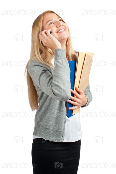 Привлекательная бизнес-леди с документами говорит по мобильному телефону