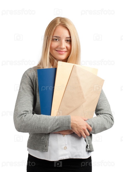 Привлекательная бизнес-леди с документами, изолированная на белом фоне