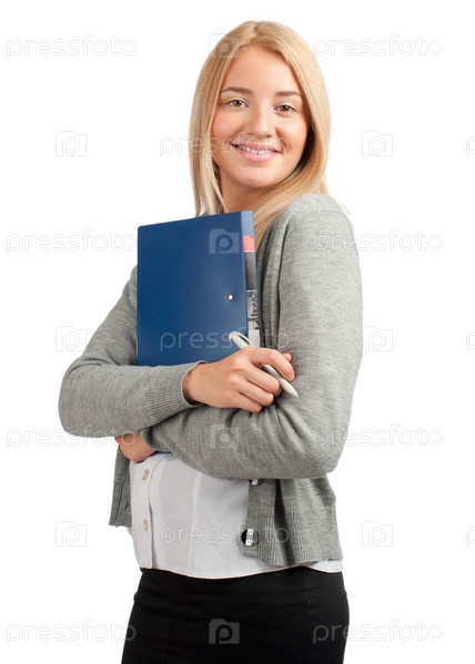Привлекательная бизнес-леди с документами, изолированная на белом фоне