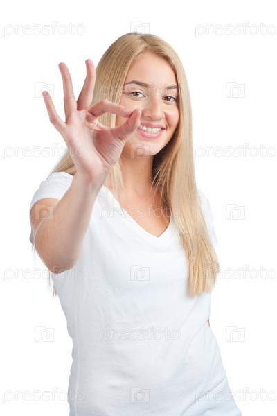 Девушка в белой футболке показывает жест ОК на белом фоне
