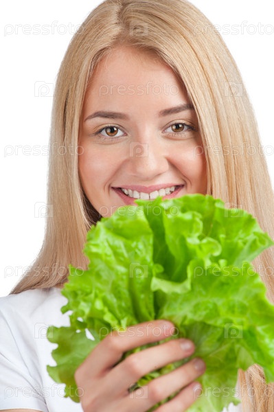 Девушка в белой футболке держит салат на белом фоне