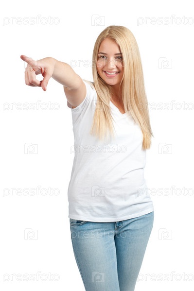 Девушка в белой футболке показывает пальцем в сторону на белом фоне