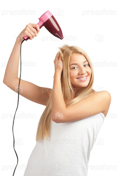 Девушка сушит волосы феном, изолированная на белом фоне