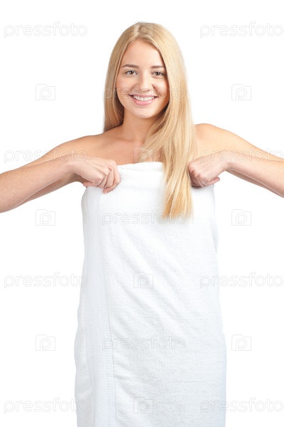 Девушка в белом полотенце, изолированная на белом фоне