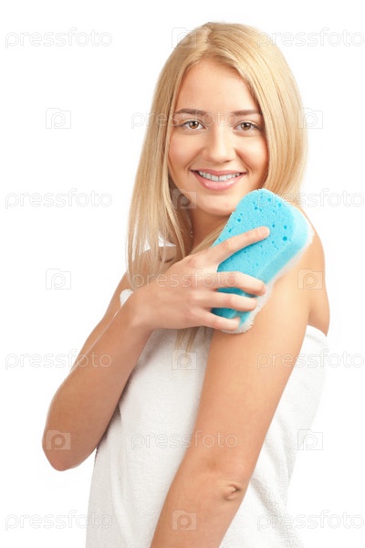 Девушка в белом полотенце с губкой, изолированная на белом фоне