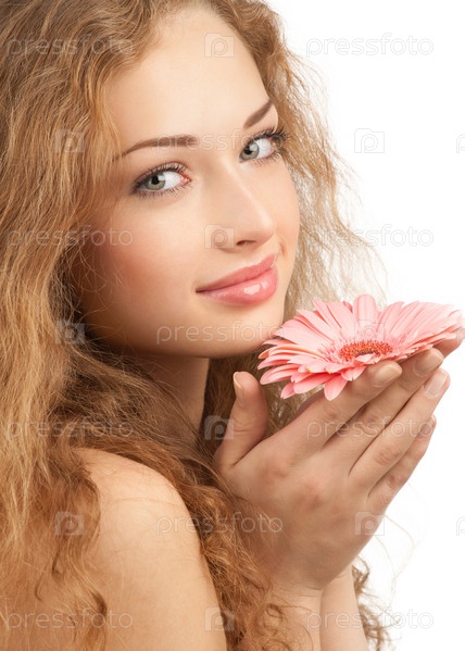 Девушка с вьющимися волосами держит розовый цветок, изолированная на белом фоне