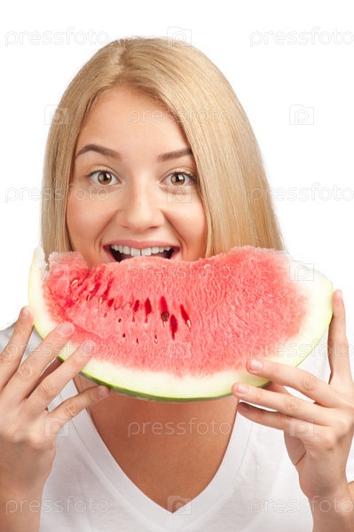 Девушка с арбузом, изолированная на белом фоне