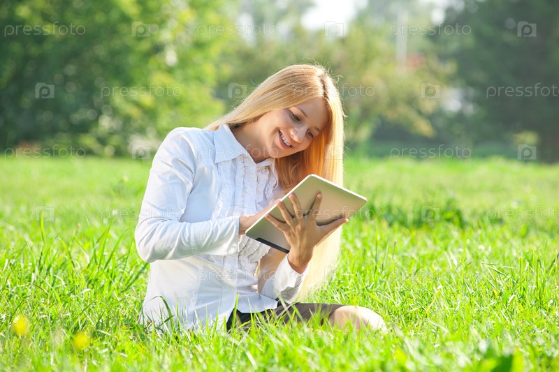 Бизнес-леди сидит на траве с планшетным компьютером