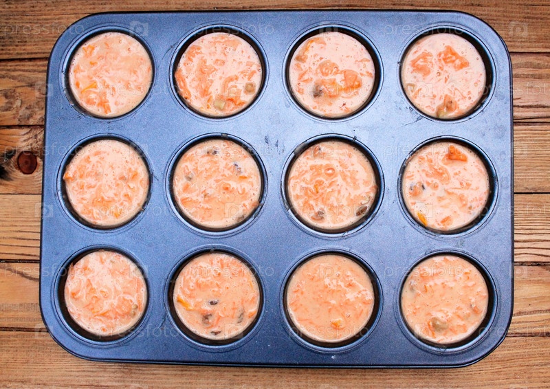 Морковные кексы с изюмом и орехами на деревянном столе