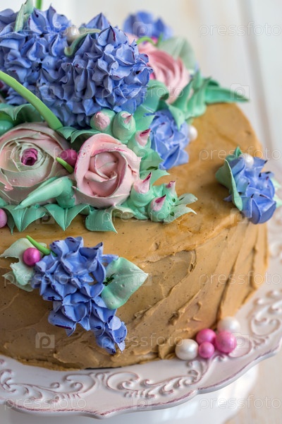 Праздничный торт с цветами из крема крупным планом
