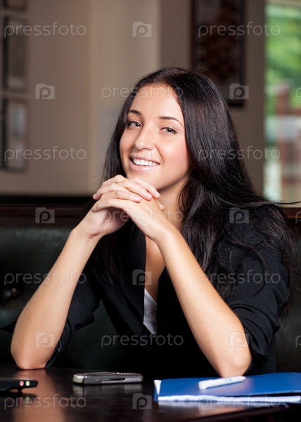 Портрет молодой привлекательной бизнес-леди в кафе