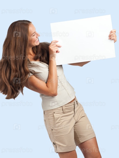 Счастливая молодая женщина с пустым баннером на белом фоне