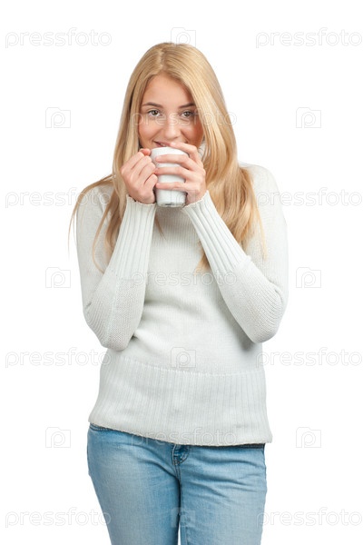 Портрет молодой девушки с чашкой кофе на белом фоне