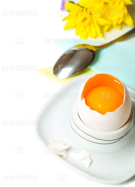 Яйцо в белой подставке, изолированное на белом фоне
