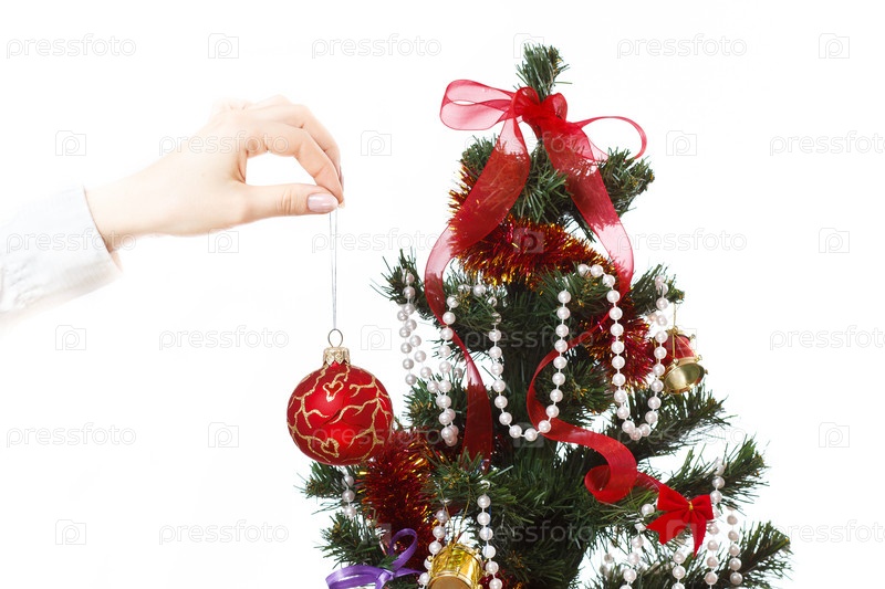 Украшать елку с шарами, лентами и вещи, изолированные на белом фоне