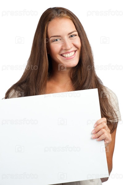 Молодая женщина с пустым баннером на белом фоне
