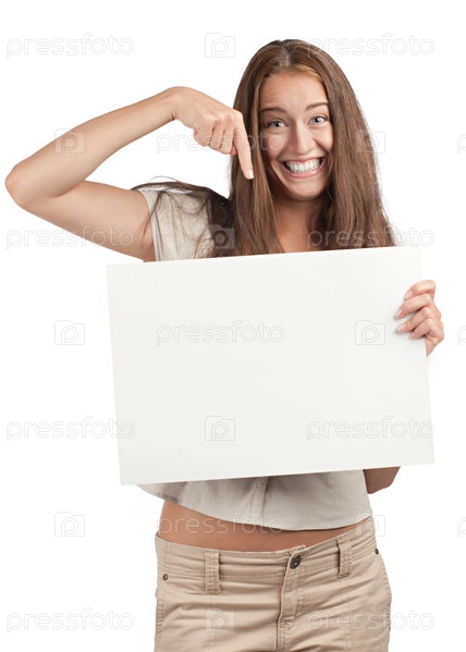Молодая женщина с пустым баннером на белом фоне