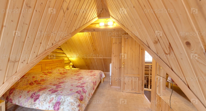 Спальня в деревянном доме с большой кроватью