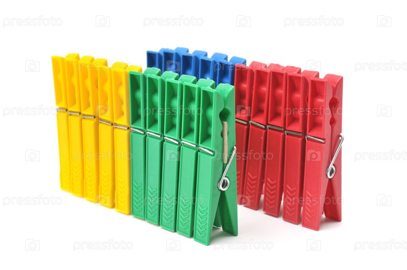Набор бельевых прищепок, изолированный на белом фоне