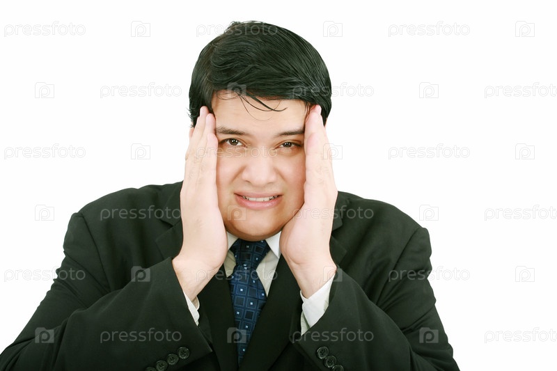 Мужчина-бизнесмен с головной болью на белом фоне