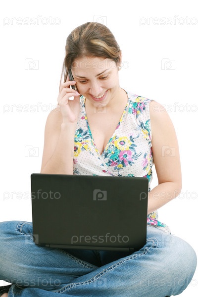 Бизнес-леди, работающая на ноутбуке на белом фоне