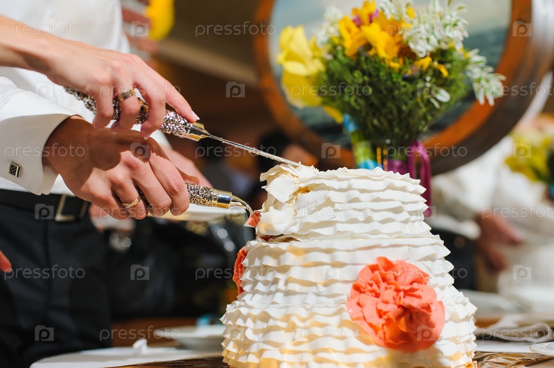 Невеста и жених разрезают торт