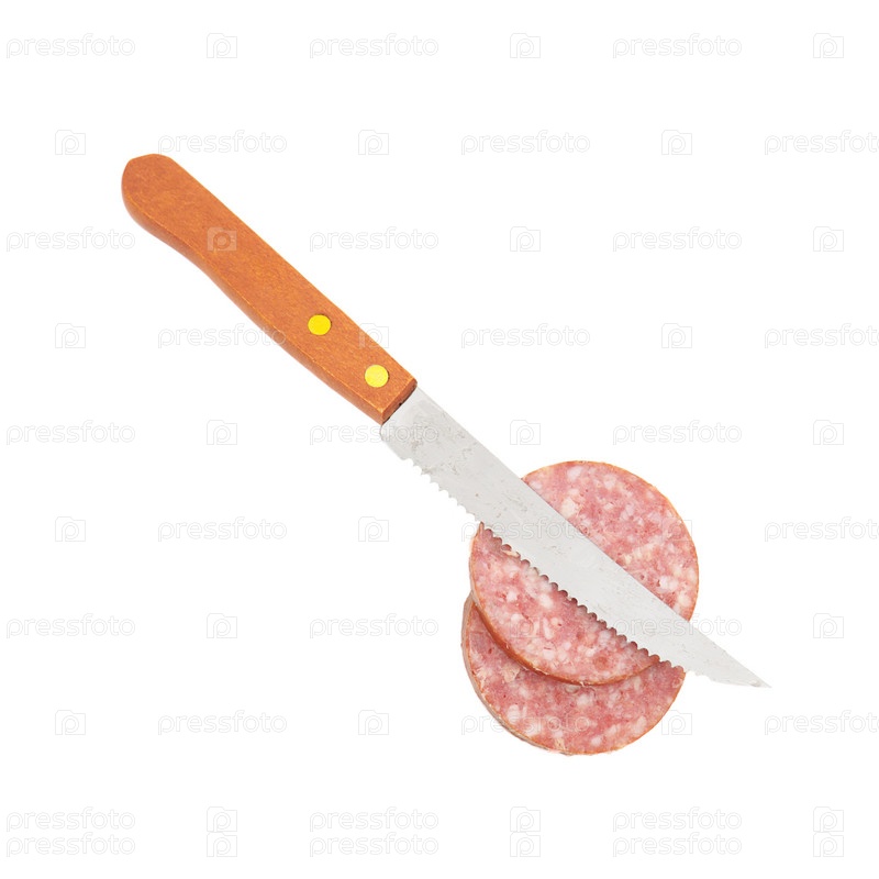 Колбаса и нож на белом фоне