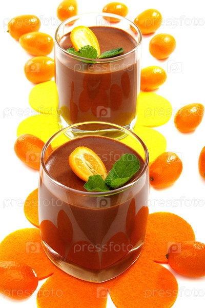 Шоколадный мусс и кумкват на белом фоне
