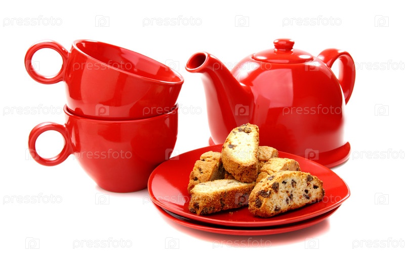 Печенье с шоколадом, чашки и чайник на белом фоне