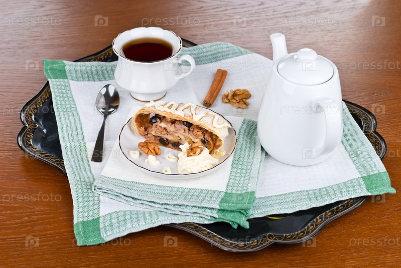 Завтрак с яблочным штруделем и чаем