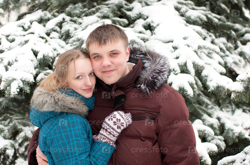 Молодая пара в зимнем лесу