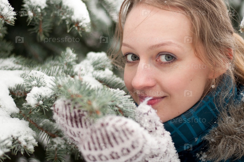 Молодая женщина в заснеженном еловом лесе