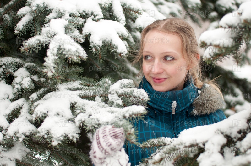 Молодая женщина в заснеженном еловом лесе