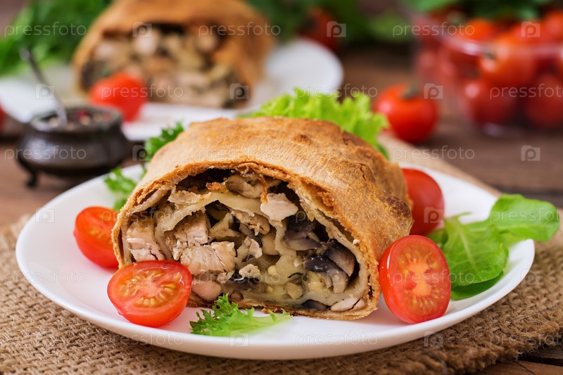 Домашний рулет с курицей, грибами, сыром и петрушкой
