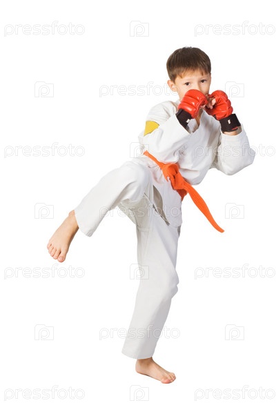 Маленький боец айкидо в белом кимоно, изолированный на белом фоне