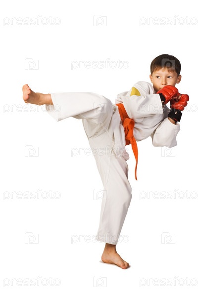 Маленький боец айкидо в белом кимоно, изолированный на белом фоне