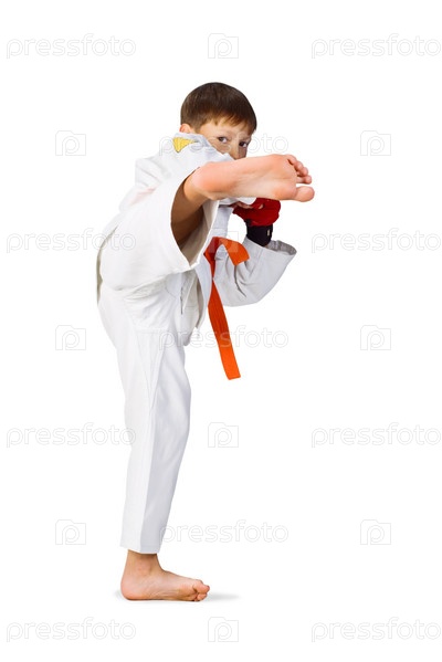 Маленький боец айкидо в белом кимоно, изолированный на белом фоне