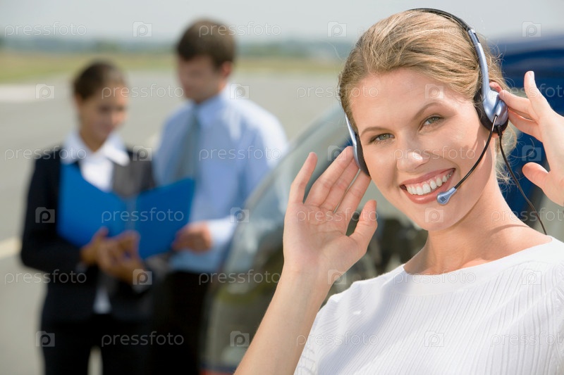 Красивая представительница клиентов с гарнитурой улыбается на фоне двух бизнесменов