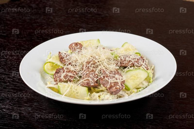 Салат из говядины, салата-латука, огурца, фасоли и китайской капусты с соусом