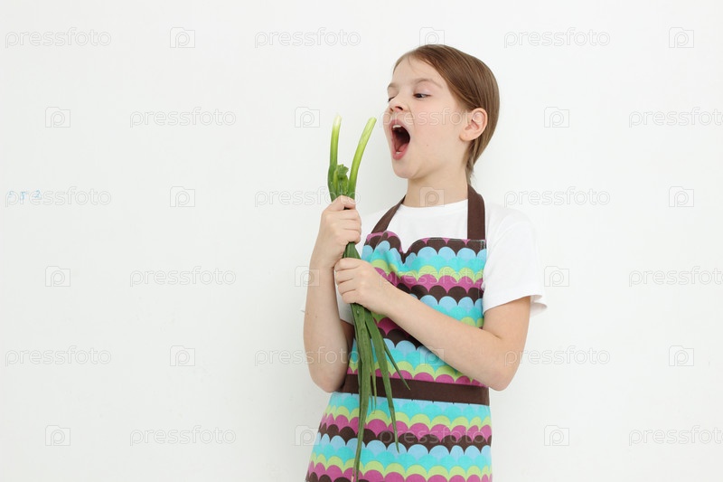 Девочка ест зеленый лук