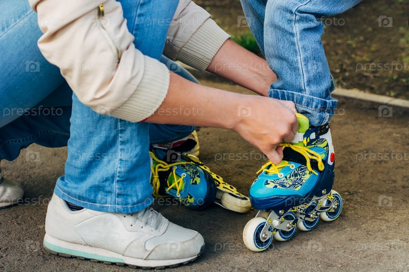 Мать помогает ребенку надеть ролики