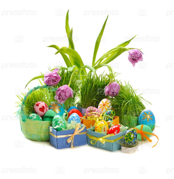 Пасхальные яйца с тюльпанами на белом фоне