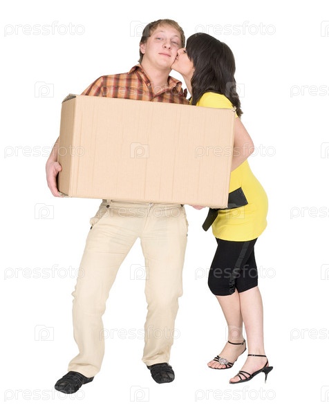 Девушка целует парня, держащего коробку
