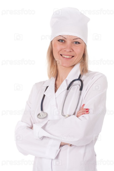 Женщина-врач со стетоскопом в белом халате стоит на белом фоне