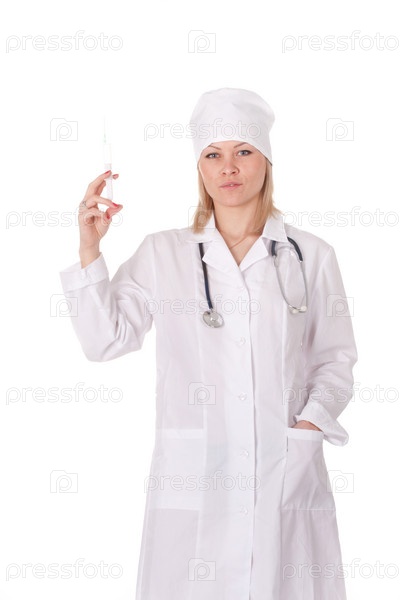 Женщина-врач со шприцем в белом халате стоит на белом фоне