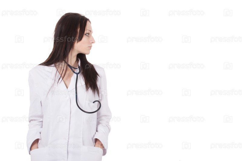 Женщина-врач со стетоскопом в белом халате стоит и смотрит в сторону на белом фоне