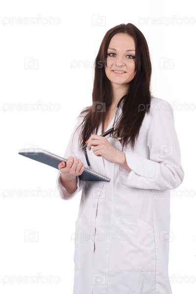 Женщина-врач со стетоскопом и планшетом в белом халате стоит на белом фоне