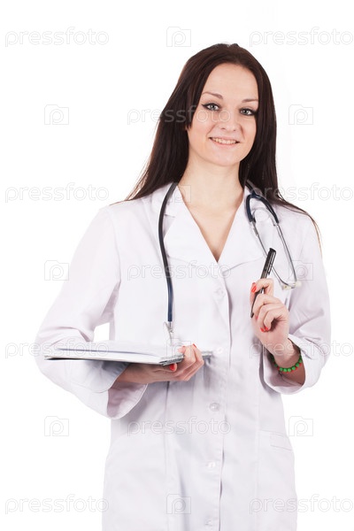 Женщина-врач со стетоскопом и планшетом в белом халате стоит на белом фоне