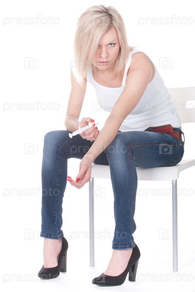 Девушка сидит на стуле и держит шприц с наркотиком на белом фоне