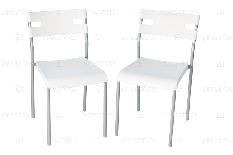 Два белых пластиковых стула на белом фоне